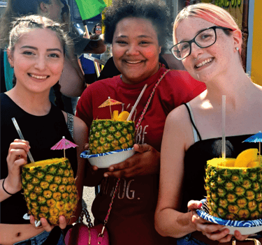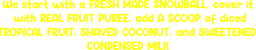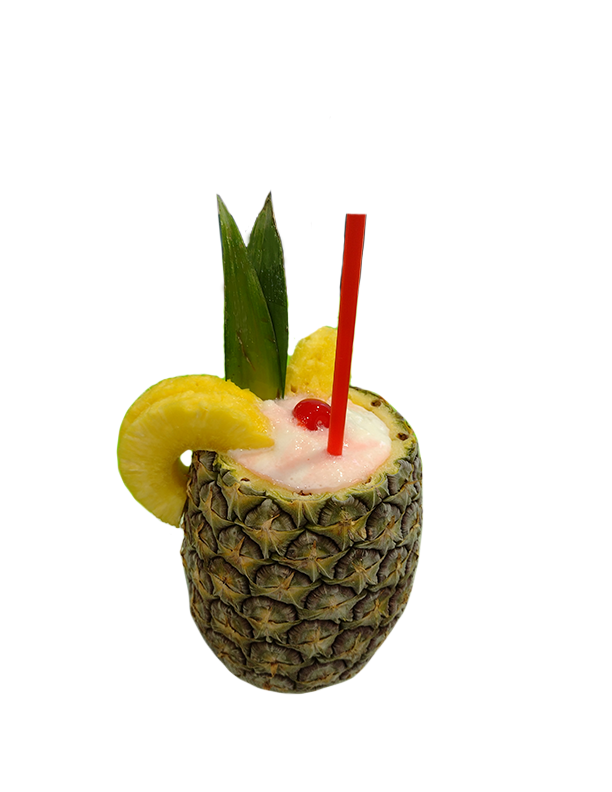 We start with a FRESH WHOLE PINEAPPLE that we crown and core. The pineapple is added to a blender with REAL FRUIT PUREES, syrups and ice. After blending we pour the Tropical Mix back into the pineapple for a true Tropical Delight!